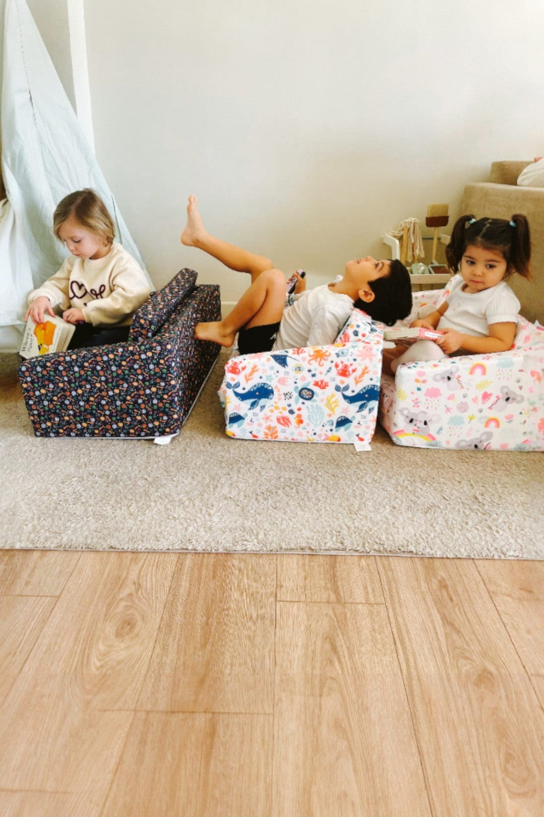 Aunque está pensado principalmente como sofá infantil para rincones de lectura Montessori, los niños lo utilizan para múltiples actividades: sentarse a ver sus dibujos favoritos en tablet con tiempo de pantalla controlado, descansar después de jugar, tumbarse para escuchar música, crear refugios y cabañas imaginarias, o simplemente como asiento extra cuando vienen amiguitos a casa. La versatilidad 2 en 1 (sofá y tumbona) multiplica las posibilidades de uso.